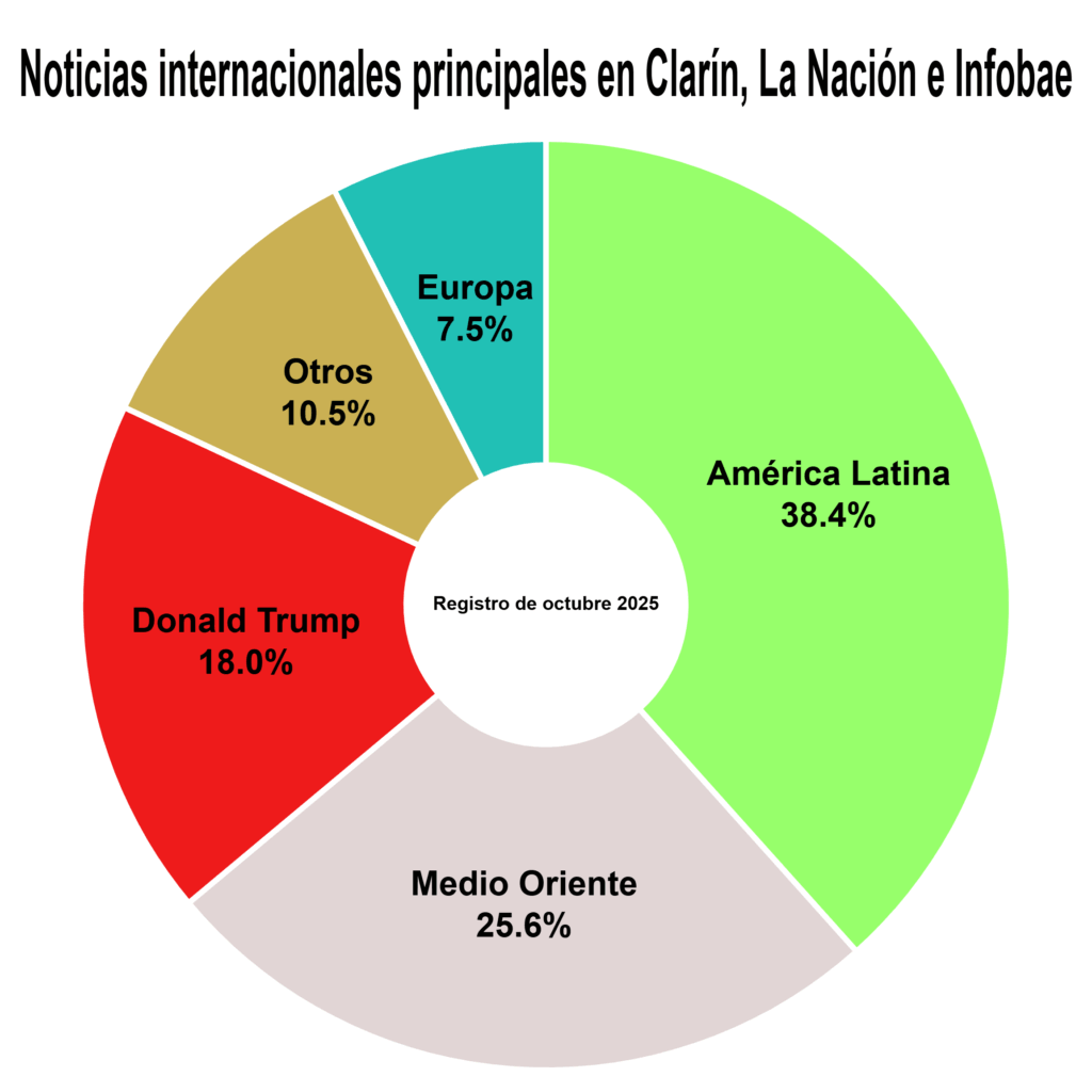 Esto dio en octubre un total de 930 títulos. Entre los internacionales, 133 en total, 38,4 por ciento correspondió a América Latina y el Caribe, 25,6 a Medio Oriente, 18 por ciento a los que tienen al presidente estadounidense, Donald Trump, como protagonista principal y 7,5 por ciento a Europa.