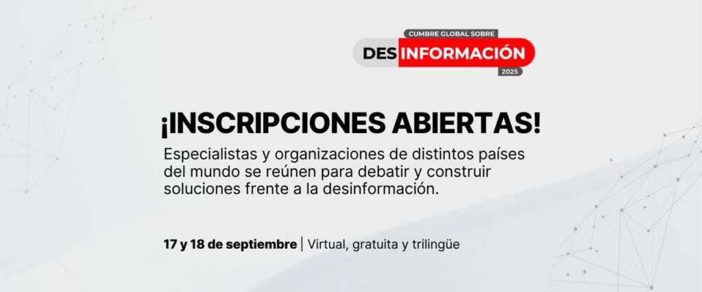 Una cumbre mundial contra la desinformación gratuita, de acceso libre y virtual, está siendo organizada por la Sociedad Interamericana de Prensa, la Fundación para el periodismo y la Fundación Desconfío, para los próximos 18 y 19 de setiembre de 2025.