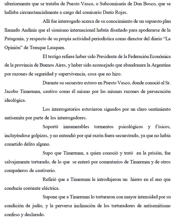 Tuvimos que mandar info sobre grupos de ultraderecha vinculados a criminales nazis que en los años ´60 agitaban ese tipo de historias, también sobre el antiperonista apologista del nazismo Walter Beveraggi Allende que arengaba sobre esa supuesta conspiración judía, y sobre los desaparecidos o secuestrados judíos de la dictadura cívico-militar que fueron salvajemente torturados para que “confiesen” su participación en ese maquiavélico plan “Andinia”, como el periodista Jacobo Timerman, padre de quien luego sería Canciller peronista Héctor Timerman. Héctor declaró sobre esa obsesión de los esbirros de Camps en el juicio por crímenes de lesa humanidad contra Von Wernitz :