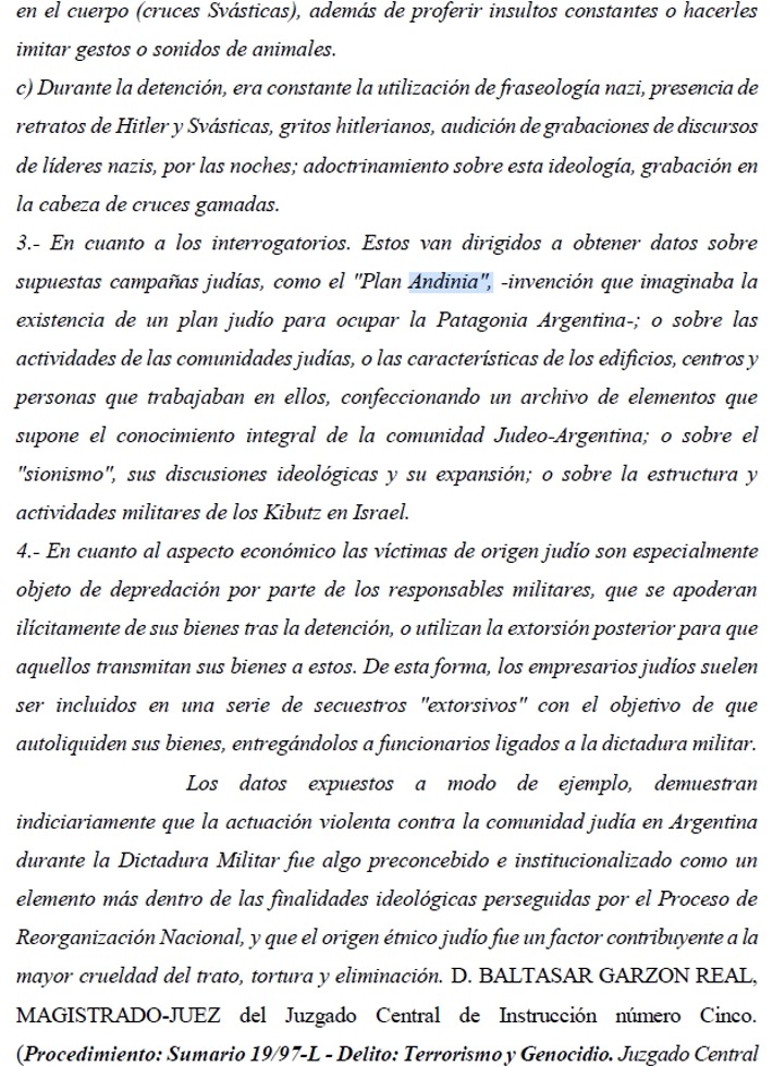 También el juez español y defensor de los Derechos Humanos Baltasar Garzón lo reflejó en un fallo donde puso a la patraña del «Plan Andinia» en el centro de la ideología antisemita de la dictadura militar: