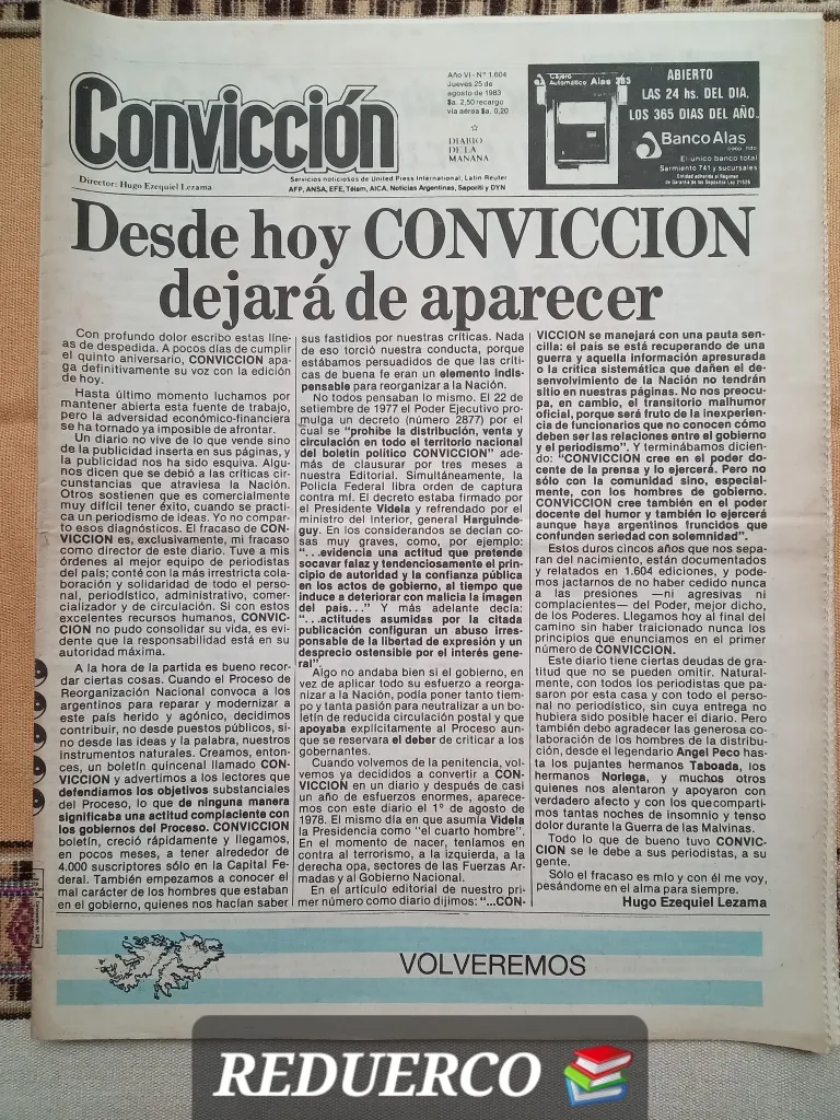 Apenas había pasado un mes del campeonato mundial de fútbol 1978. Todavía se oían cornetas y colgaban banderas de los edificios. Los noticieros no dejaban de mostrar esa foto bizarra, con Videla en primer plano, de los miembros de la Junta de Comandantes festejando el gol de Kempes. Los dictadores, los asesinos, lucían felices y esperanzados. Fue entonces, el 1 de agosto de 1978, que comenzó a circular por Buenos Aires el diario Convicción.